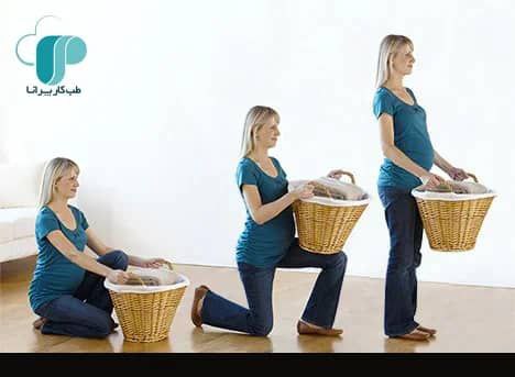 – هنگام بلند کردن اشیا از روی زمین توسط خانم های باردار باید پاها با فاصله از هم قرار گرفته و شیء به کمک زانوهای خمیده و به شیوه اسکات از زمین بلند گردد.