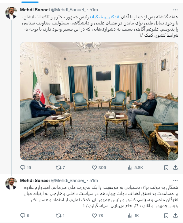 به گزارش خبرگزاری خبرآنلاین، مهدی سنایی در رشته توییتی در صفحه شخصی خود در فضای مجازی نوشت: هفته گذشته پس از دیدار با آقای دکتر پزشکیان رئیس جمهور و تاکیدات ایشان، با وجود تمایل قلبی برای ماندن در فضای علمی و دانشگاهی مسئولیت معاونت سیاسی را پذیرفتم.